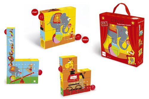 Puzzle rollercoaster to wyjątkowa układanka, która rozwija wyobraźnię przestrzenną i umiejętności manualne, a także uczy logicznego myślenia oraz rozwiązywania problemów. Zestaw przygotowano w taki sposób, by dziecko mogło ułożyć trzy śliczne obrazki przedstawiające zwierzęta cyrkowe, ale możliwości zabawy jest więcej – warto zachęcić szkraba do zbudowania tunelu lub zjeżdżalni dla kul według własnego pomysłu!
