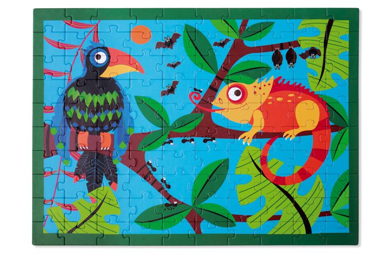 Puzzle podłogowe Tukany to świetny pomysł na prezent dla małego miłośnika przyrody. Zestaw zawiera 100 elementów, więc świetnie sprawdzi się w przypadku pięciolatka lub nieco starszego dziecka. Po ułożeniu wszystkich puzzli smykowi ukaże się śliczny obrazek przedstawiający ukrywające się między gałęziami zwierzęta: tukana, kameleona, nietoperze oraz mrówki. Wszystkie elementy zestawu są zapakowane w okrągłe, ozdobne pudełko.