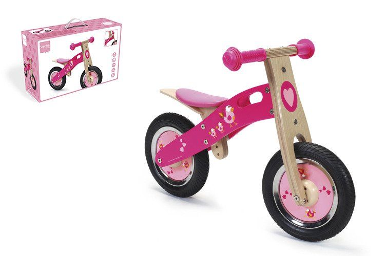 Rowerek biegowy Ptaszki podbije serca dzieci, które przepadają za kolorem różowym! Pojazd jest dostosowany do potrzeb początkujących rowerzystów. Pompowane opony ochraniają stawy, a kierownica z ograniczonym kątem obrotu sprawia, że podczas skręcania szkrabowi nie grozi upadek. Wysokość siodełka można regulować, dopasowując ją do wzrostu dziecka. Pojazd wykonano z trwałego drewna klejonego warstwowo i wyposażono w dzwonek.