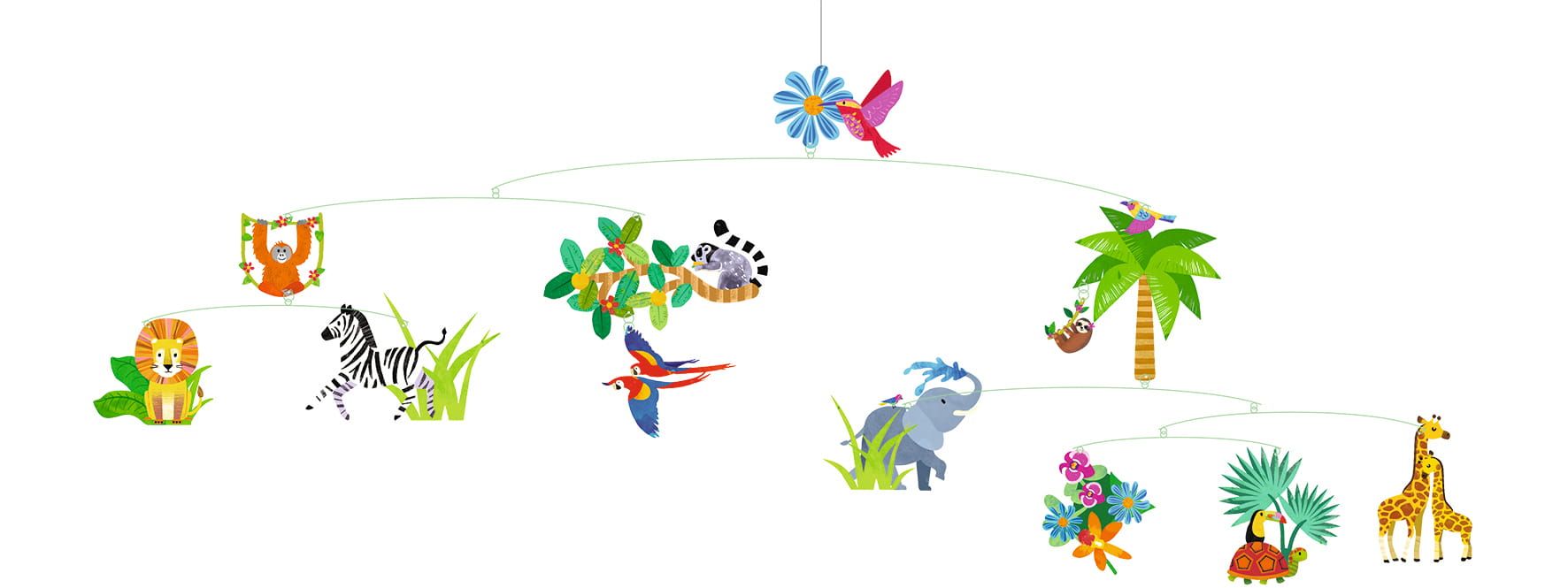 Ruchoma dekoracja Djeco do zawieszenia nad sufitem przeniesie smyka do świata niesamowitych zwierząt zamieszkujących dziką dżunglę. Akcesorium zostało wykonane z trwałych materiałów z dużą starannością, dlatego cudownie się prezentuje. Z pewnością zainteresuje maluszka!