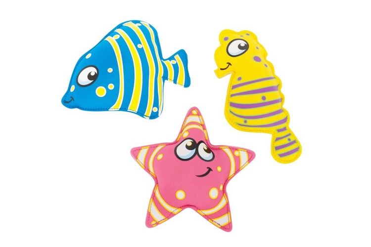 Rybki do nurkowania to wspaniały pomysł na prezent dla miłośników podwodnych przygód! Zestaw zawiera trzy zabawki przedstawiające rybkę, konika morskiego oraz rozgwiazdę. Zadaniem brzdąca jest wyłowienie ich, kiedy zaczną powoli opadać na dno. Zabawki są wykonane z wytrzymałego neoprenu i wypełnione piaskiem.