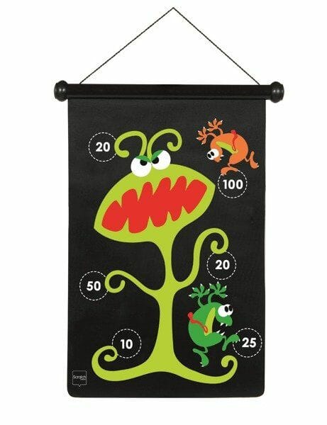 Gra w rzutki to świetna zabawa, która rozwija celność, precyzję ruchów oraz koordynację ręka – oko. Rozgrywkę można urozmaicać na wiele sposobów, na przykład zwiększając odległość od tarczy lub korzystając z obu jej stron na przemian. Żywe, przyciągające wzrok kolory obrazków z pewnością zachęcą szkraba do podjęcia próby pokonania potworów. Jak je unieszkodliwić? Oczywiście przez trafienie w sam środek najwyżej punktowanych pól na tarczy!