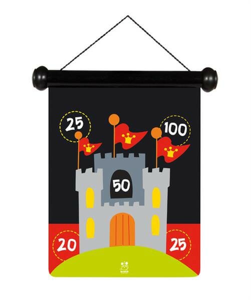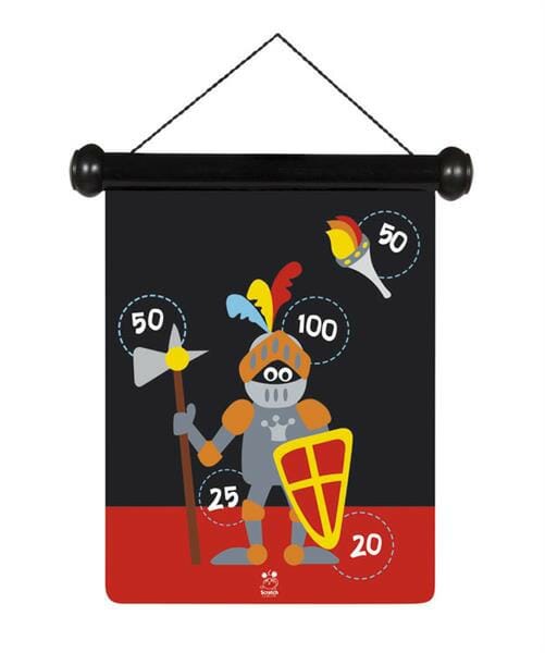 Rzutki magnetyczne Rycerz zapewnią małym wojownikom i wojowniczkom dużo dobrej zabawy! Zestaw składa się z dwustronnej tarczy ozdobionej ilustracjami przedstawiającymi dzielnego rycerza oraz okazały zamek, a także sześciu lotek z zaokrąglonymi końcówkami, dzięki którym swoich sił w grze mogą spróbować również najmłodsi. Po skończonej zabawie tarczę można schować do przeznaczonej dla niej tuby.