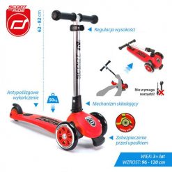 Hulajnoga Highwaykick 3 Red posiada bardzo solidną konstrukcję. Dwa przednie koła zostały wykonane z trwałego, amortyzującego wstrząsy materiału, co zapewnia komfort podczas jazdy. Tylne koło posiada błotnik i łatwy w obsłudze hamulec. Dodatkowo hulajnoga ma antypoślizgowy podest, a jej rączka posiada komfortowe uchwyty, które zapobiegają ześlizgiwaniu się dłoni. Całość została zapakowana w kartonowe pudełko, dzięki czemu doskonale sprawdzi się jako prezent.