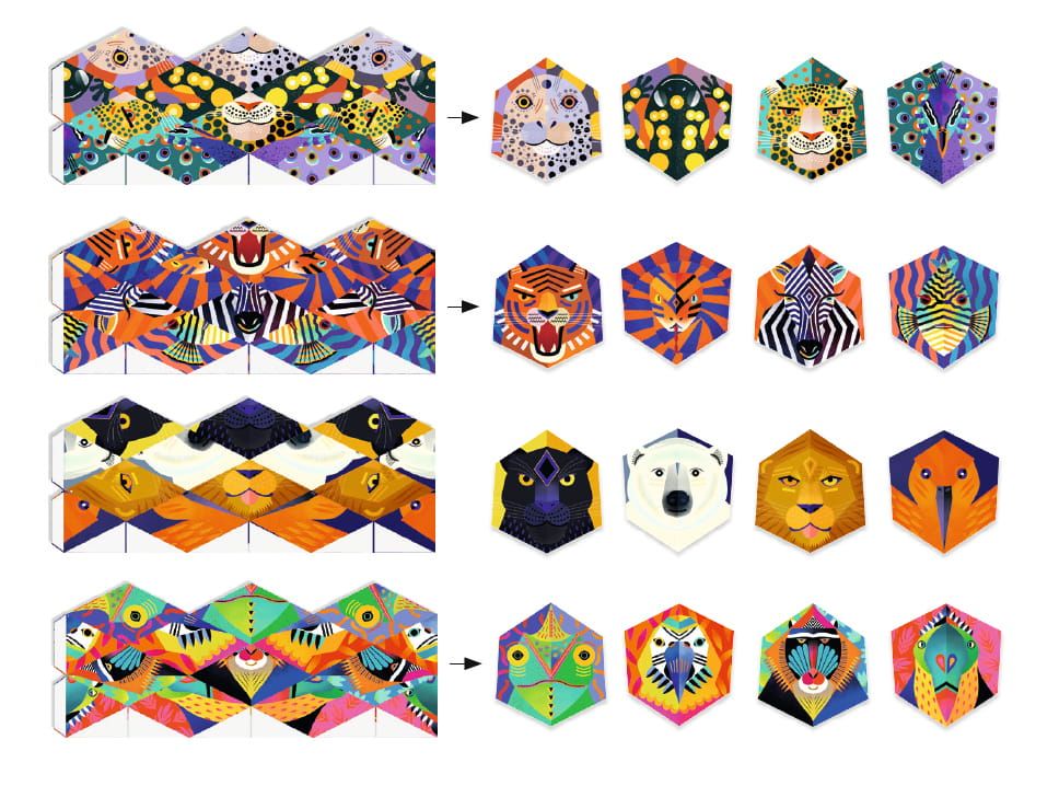Zestaw zawiera 4 arkusze z grafiką zwierząt do składania (każdy arkusz zawiera 4 głowy zwierząt, które odsłaniają się w zależności jak złoży się składankę).