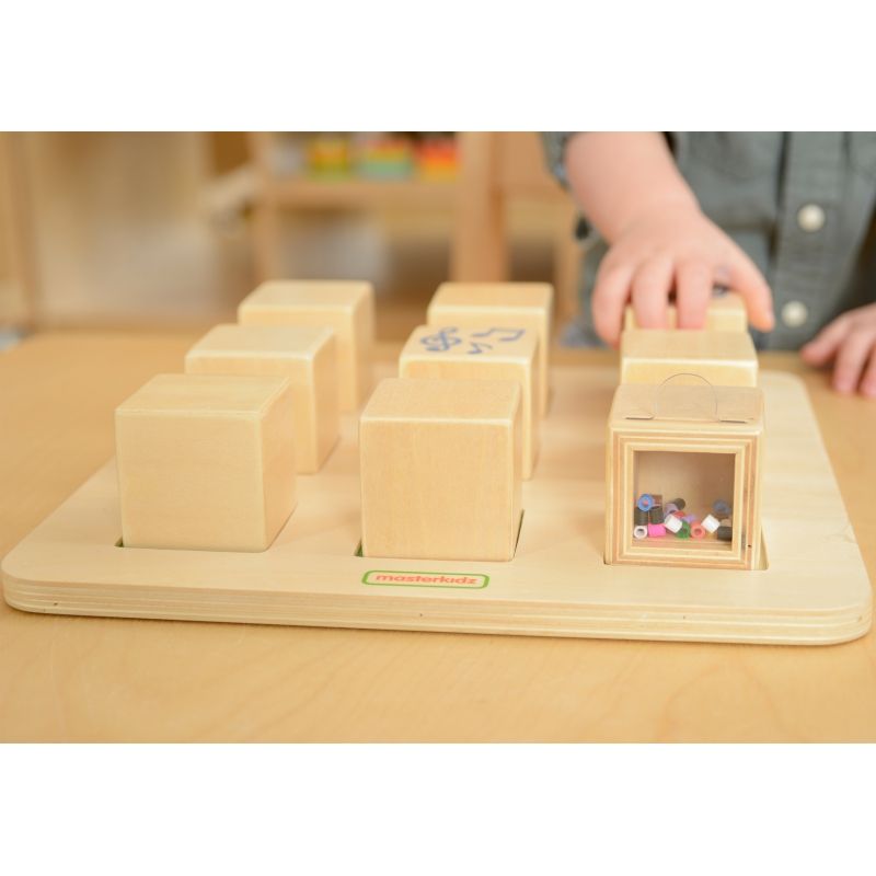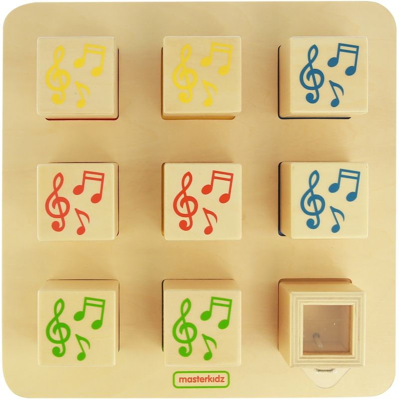 Zabawa sorterem sensorycznym stymuluje zmysł słuchu i uczy rozpoznawania dźwięków. Malec musi dobrze wsłuchać się w dźwięki wydobywające się z kostek, by móc odnaleźć pary! Kiedy wszystkie klocki znajdą się na planszy, brzdąc może odwrócić je tak, by widzieć narysowane nutki – w ten sposób przekona się, czy właściwie wykonał zadanie.