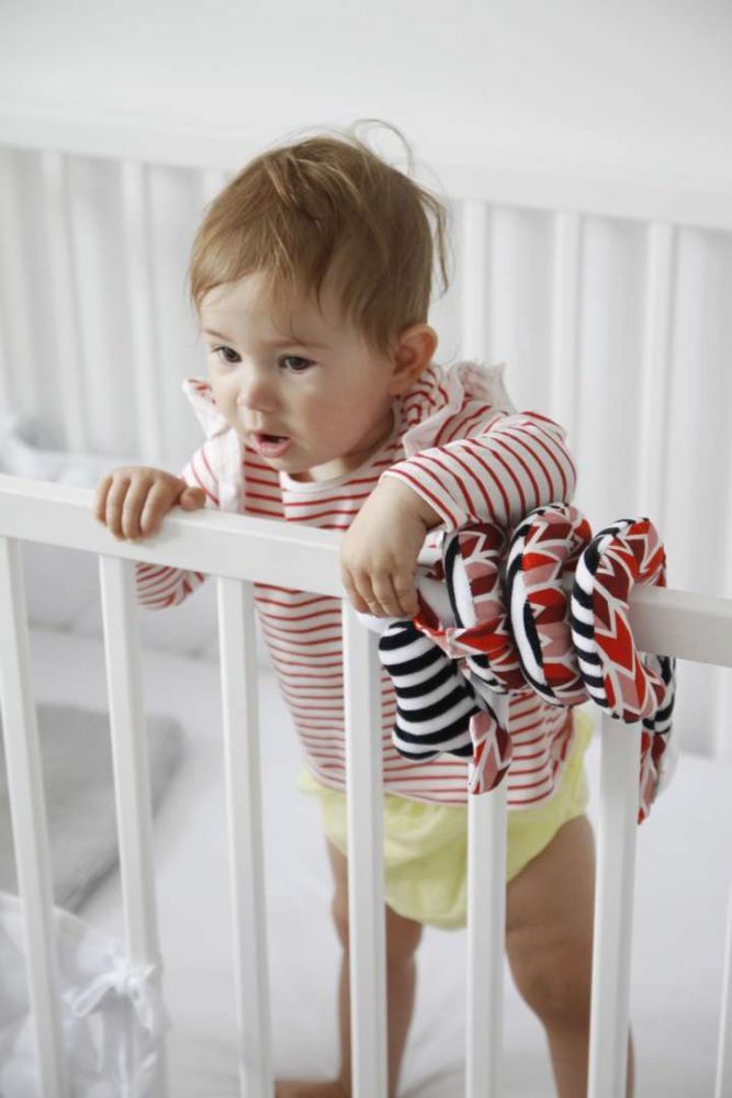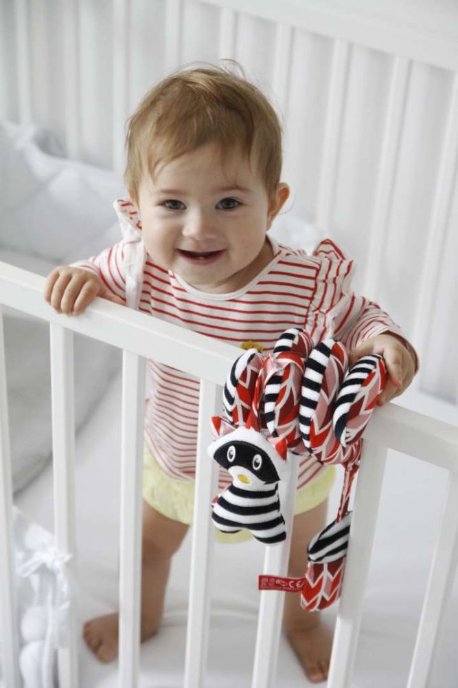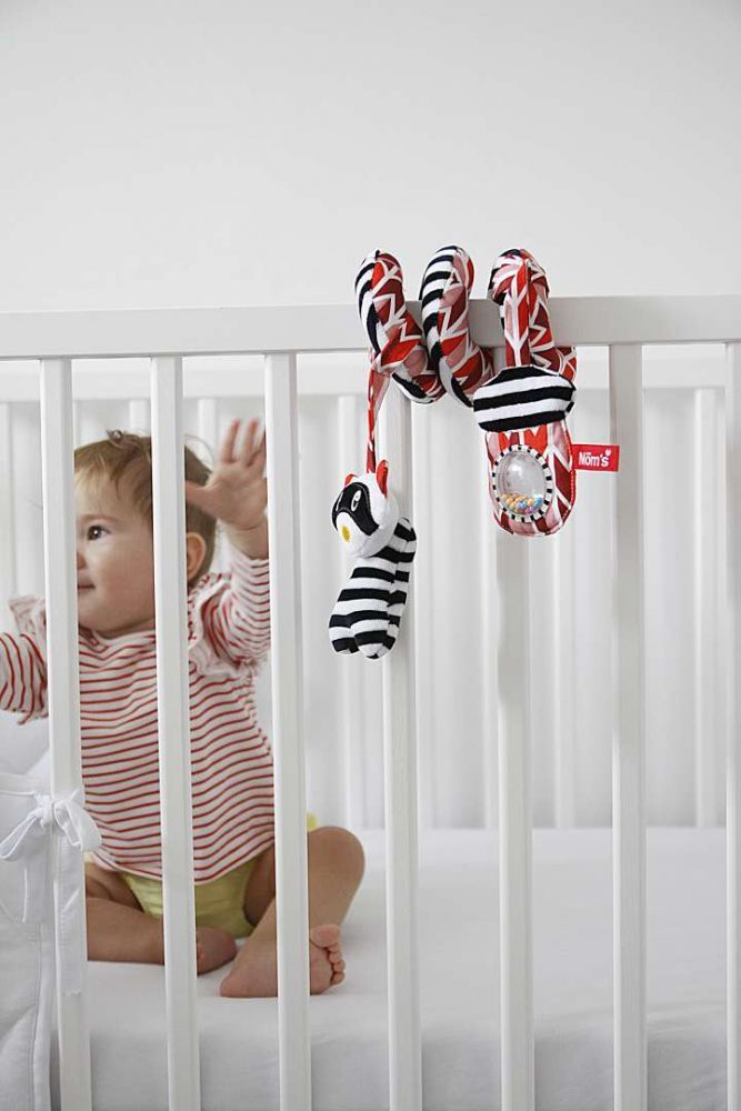 Spirala wykonana jest z miękkich materiałów, zaletą jest wyrazista, kontrastowa kolorystyka, dzięki której maluszek będzie wyraźnie widział zabawkę. Produkt można prać ręcznie w ciepłej wodzie z dodatkiem mydełka dla niemowląt. Spiralę można założyć na łóżeczko lub pałąk od wózka.