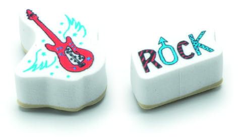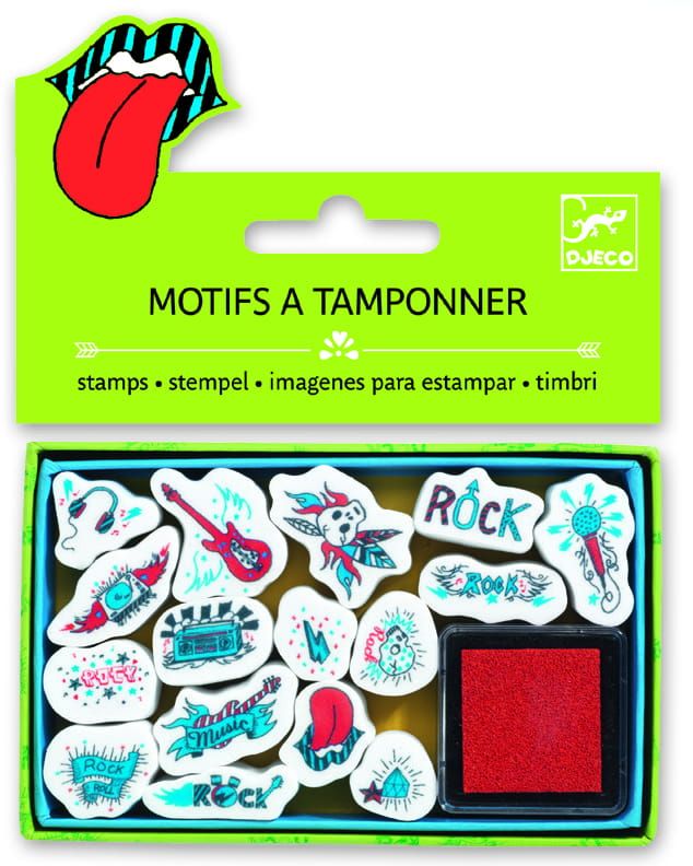 Zestaw małych stempelków do zdobienia. Piankowe stempelki są w kształcie instrumentów i motywów muzycznych. W zestawie jest aż 17 pieczątek oraz 1 pudełeczko z tuszem w kolorze czerwonym.