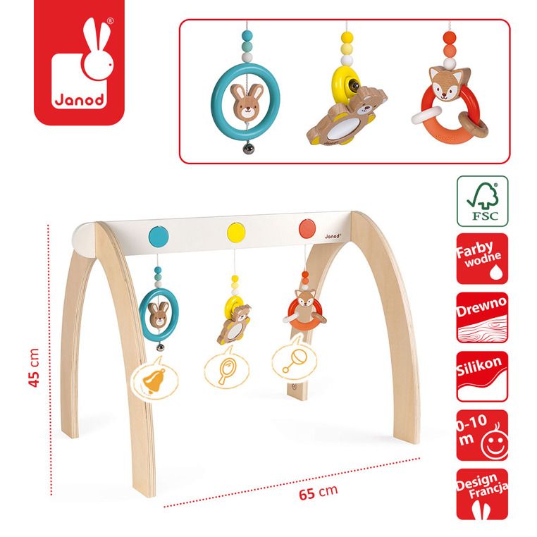 Ten stabilny i bezpieczny łuk idealnie nadaje się dla dzieci od urodzenia do 10. miesiąca życia. Wykonany jest z najwyższej jakości drewna, posiadającego certyfikat FSC – materiał pochodzi z odpowiedzialnie zarządzanych lasów. Na łuku zawieszone są trzy zabawki: króliczek z dzwonkiem, miś z lusterkiem na brzuchu oraz lisek z obręczami, które można przesuwać i grzechotać. Wszystkie są przystosowane do małych rączek dziecka, by te z łatwością mogło się nimi bawić.