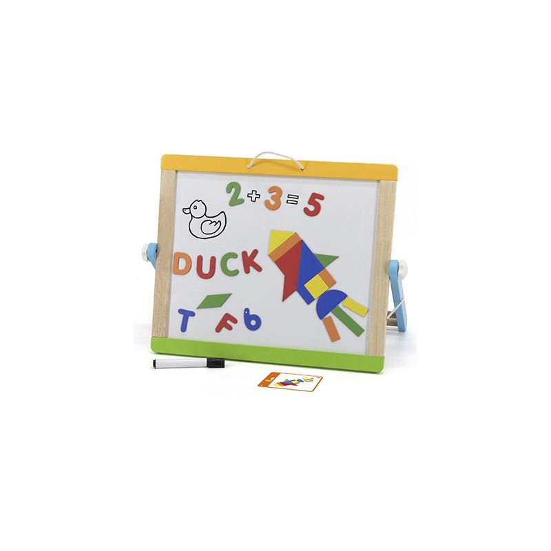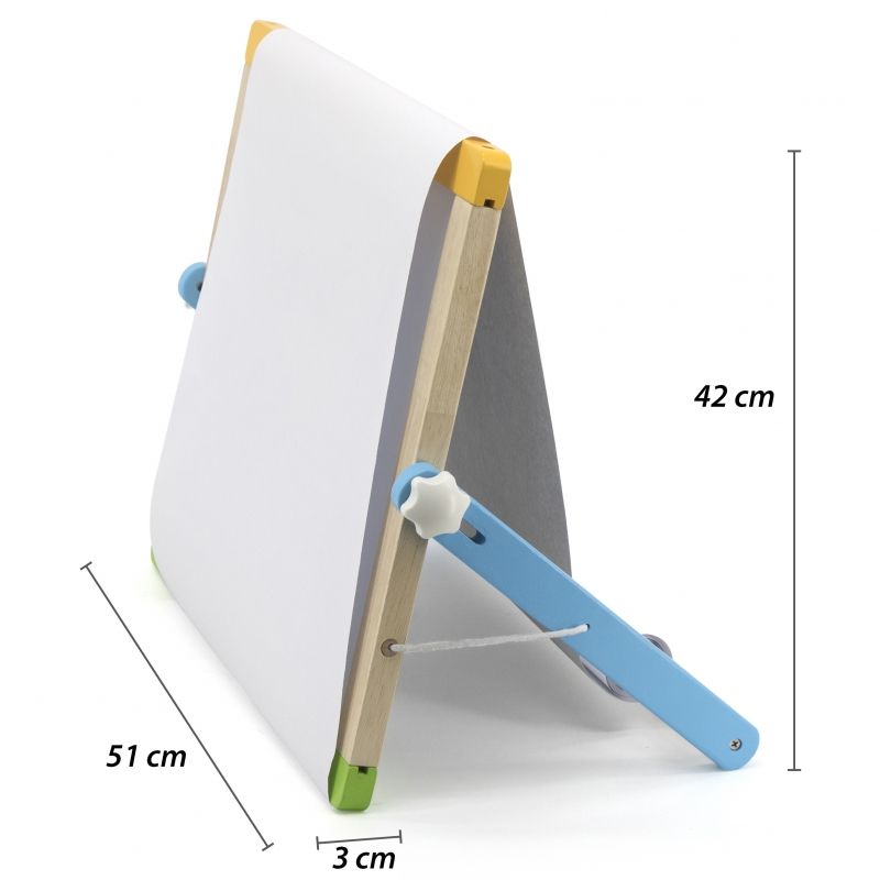 VIGA Tablica Magnetyczna 2w1 z Akcesoriami to wspaniały i wielofunkcyjny produkt, który zachęci dzieci do malowania, rysowania i pisania. Dwustronna tablica w zestawie zawiera: 26 magnesów z literkami, 10 cyfr, 29 magnesów z figurami geometrycznymi, 10 kart z instrukcją, zestaw kred, gąbeczkę do wycierania tablicy, marker, rolkę papieru oraz worek do przechowywania wszystkich akcesoriów. Tablica jest prosta w montażu, dzięki czemu łatwa w przechowywaniu oraz w transporcie. Z jednej strony znajduje się tablica kredowa, a z drugiej magnetyczna (z funkcją pisania markerem). Dodatkowo tablica posiada rolkę z papierem, którą może nałożyć na tablicę i dowolnie rysować. Te wszystkie funkcje tablicy zachwycą każdego malucha. Dziecko może korzystać według własnych upodobań i chęci. Kolory i kształty magnesów pozwolą na kreatywną zabawę. Ta tablica na pewno pobudzi wyobraźnie naszego malucha.