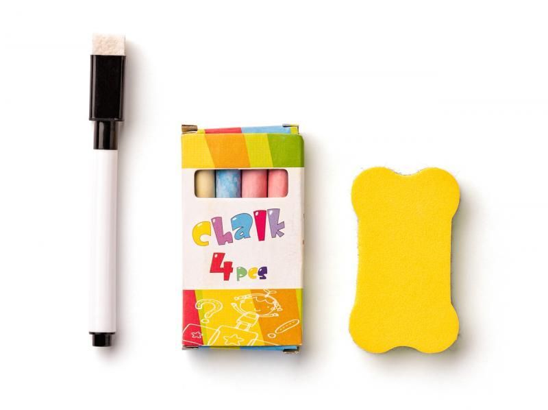 Do zestawu dołączono zestaw magnesów w kształcie: literek a-z (bez polskich znaków), cyfr 0-20, znaku dodawania, odejmowania, dzielenia, mnożenia, równości, większości/mniejszości oraz znaku zapytania. W zestawie znajdziemy także 4 kolorowe kredy, pisak suchościeralny oraz gąbeczkę do ścierania kredy i pisaka.