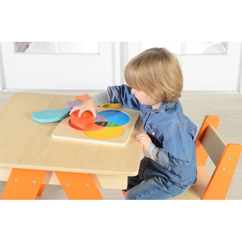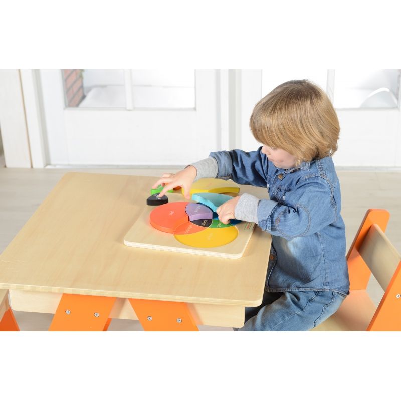 Edukacyjna Tablica Mieszanie kolorów z pewnością spodoba się dzieciom ciekawym świata. Z jej pomocą maluch będzie mógł eksperymentować z kolorami. Na elementach znajduje się również nazwa koloru w języku angielskim. Całość wykonano z wysokiej jakości drewna, co sprawia, że będzie można cieszyć się wesołą zabawą przez naprawdę długi czas!