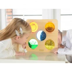 Tablica sensoryczna Kolorowe szkiełka zachwyci każdego małego odkrywcę. Zabawka składa się z drewnianej planszy z pięcioma szkiełkami w kolorach czerwonym, pomarańczowym, niebieskim, zielonym i żółtym. Przy każdym szkiełku znajduje się nazwa barwy w języku angielskim. Kiedy smyk spojrzy przez wybrane okienko, zobaczy otoczenie w zupełnie nowym kolorze!
