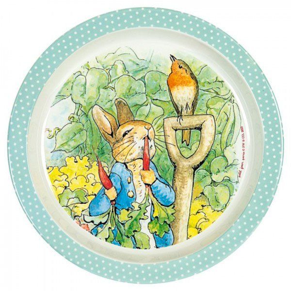 Talerz dla dzieci z Królikiem Piotrusiem i zieloną obwódką doskonale sprawdzi się podczas nauki samodzielnego jedzenia. Produkt wykonano z melaminy – oznacza to, że jest lekki, nie tłucze się w razie upadków, a co najważniejsze nie wytwarza żadnych szkodliwych substancji. Produkt ten przeszedł wszystkie badania, aby być dopuszczonym do użytku przez dzieci oraz do kontaktu z żywnością. Produkt bez obaw można myć w zmywarce!
