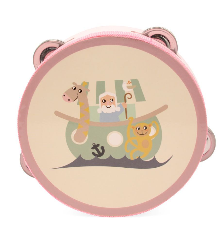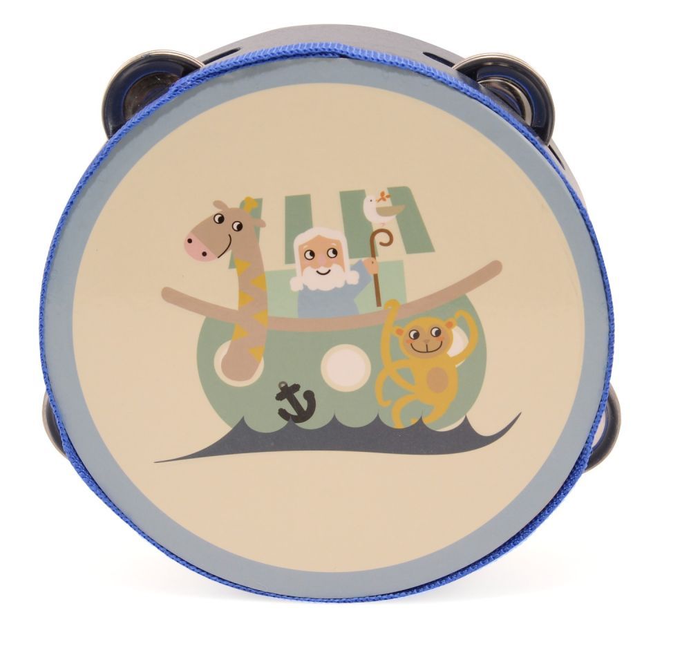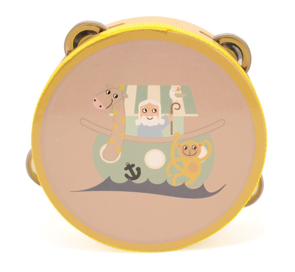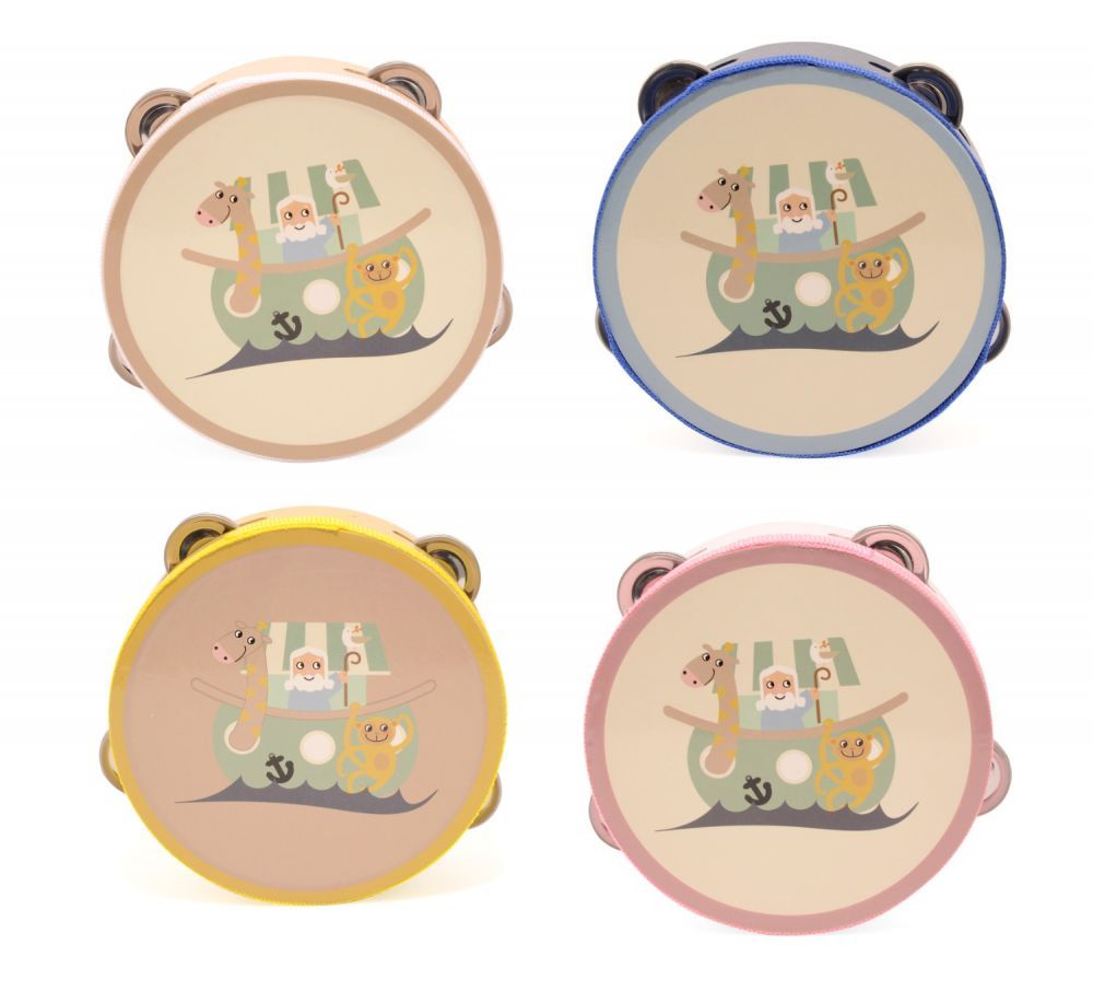Tamburyno doskonale sprawdzi się podczas domowych zabaw, jest również niezbędnym elementem wyposażenia sal przedszkolnych i żłobkowych. Ważną zaletą prezentowanego instrumentu jest piękne wykończenie – na froncie umieszczono ilustrację przedstawiającą Arkę Noego oraz zwierzęta w niej płynące. Do wyboru są 4 wersje kolorystyczne: niebieska, różowa, żółta, brązowa.