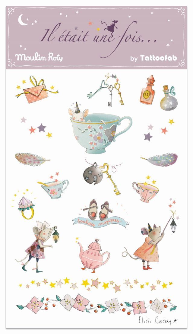 Te małe tatuaże z kolekcji „Dawno, dawno temu… ” zadowolą wszystkich małych czarodziejów: myszka, imbryk, magiczny eliksir itd. Aby je przykleić, wystarczy trochę wody!