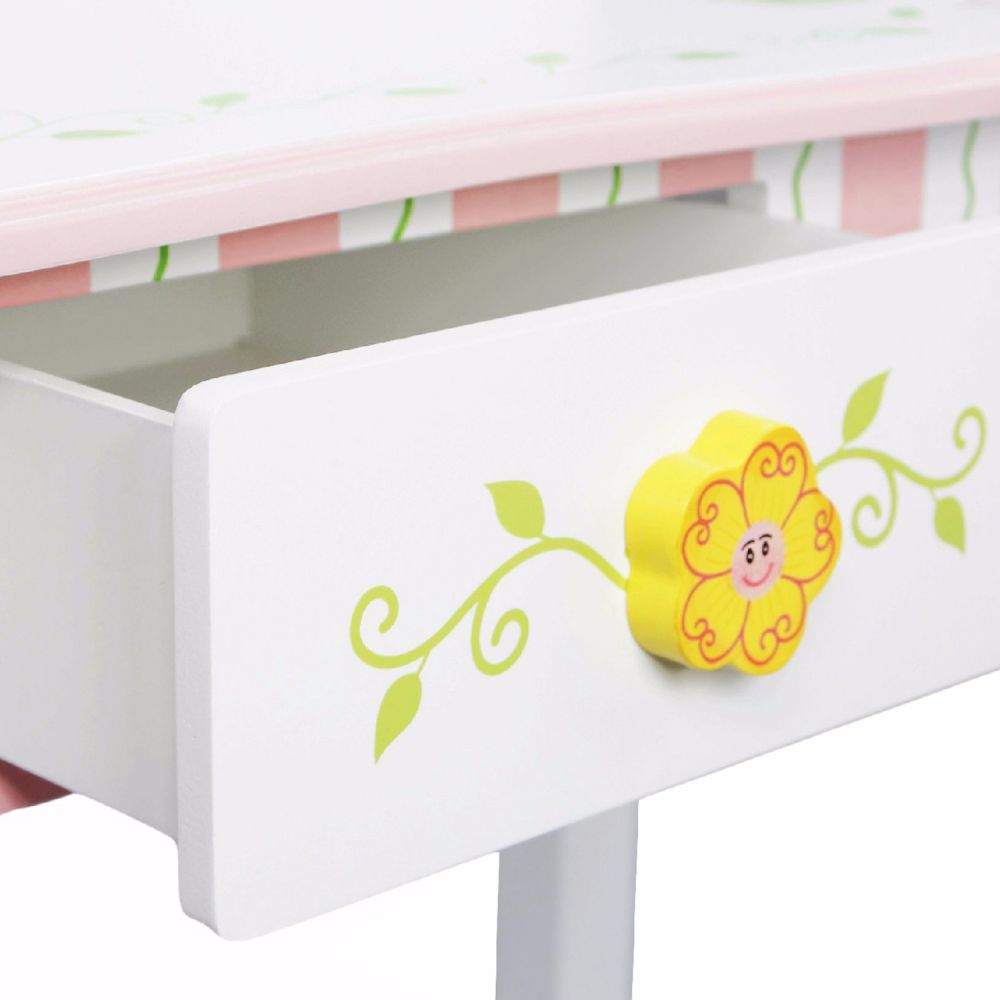 Komplet składa się z komódki z lusterkiem i szufladką oraz krzesełka. Komódka jest ręcznie malowana, całość pokrywają piękne zdobienia w delikatnych kolorach. Produkt cechuje doskonała jakość wykonania.