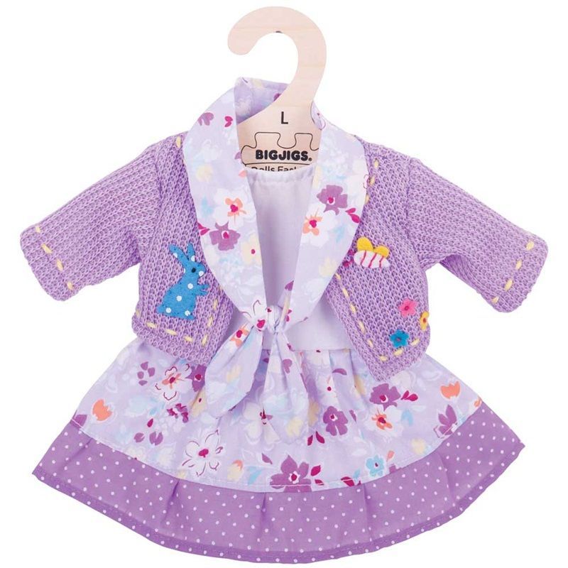 Ubranko dla lalki Fioletowe Bigjigs spodoba się każdej lalce oraz jej właścicielce! Zabawa lalkami to jedna z ulubionych zabaw dziewczynek, a dzięki dodatkowym ubrankom ta zabawa będzie jeszcze lepsza! Ubranko będzie pasować na szmaciane lalki firmy Bigjigs. W skład zestawu wchodzi: sukienka w kwiaty i kropeczki (zapinana z tyłu na rzep), fioletowy sweterek z króliczkiem i pszczółką oraz drewniany wieszak. Uwaga: szal widoczny na zdjęciu nie jest częścią zestawu.