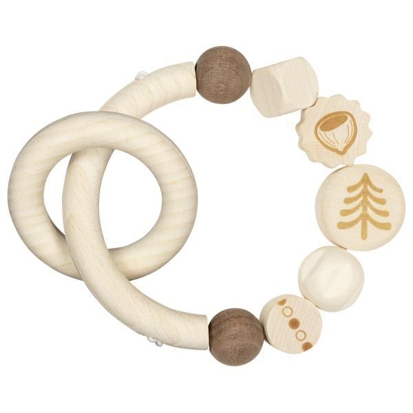 Uchwyt elastyczny Nature Heimess ucieszy każdego niemowlaka. Najbardziej atrakcyjnymi elementami zabawki są: koraliki z wyrytym kształtem drzewa i żołędzia. Cała zabawka ma formę dwóch obręczy połączonych ze sobą – dziecko może łatwo ją chwycić, a podczas potrząsania słuchać jak jedna obręcz uderza o drugą. Koraliki mają różne kształty, co będzie dodatkowo stymulowało zmysł dotyku malucha.