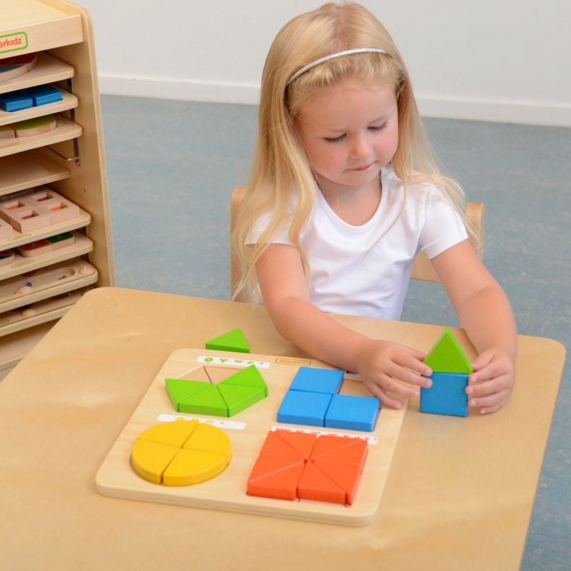 Układanka Budowanie figur geometrycznych zapewni smykowi mnóstwo świetnej zabawy! W opakowaniu brzdąc znajdzie 22 kolorowe klocki w różnych kształtach oraz drewnianą planszę, na której przedstawiono etapy budowania figur. Malec może postępować według wskazówek, samodzielnie układać klocki na planszy lub… tworzyć figury według własnych pomysłów poza nią, puszczając wodze fantazji!