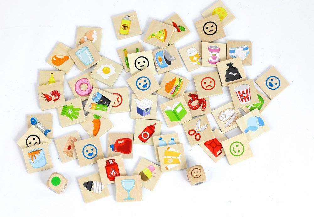 Zestaw może służyć do grania w grupie lub do zabawy w pojedynkę – dziecko może wrzucać do odpowiednich otworów obrazki z odpadami, a następnie sprawdzić czy kolory buziek się zgadzają.