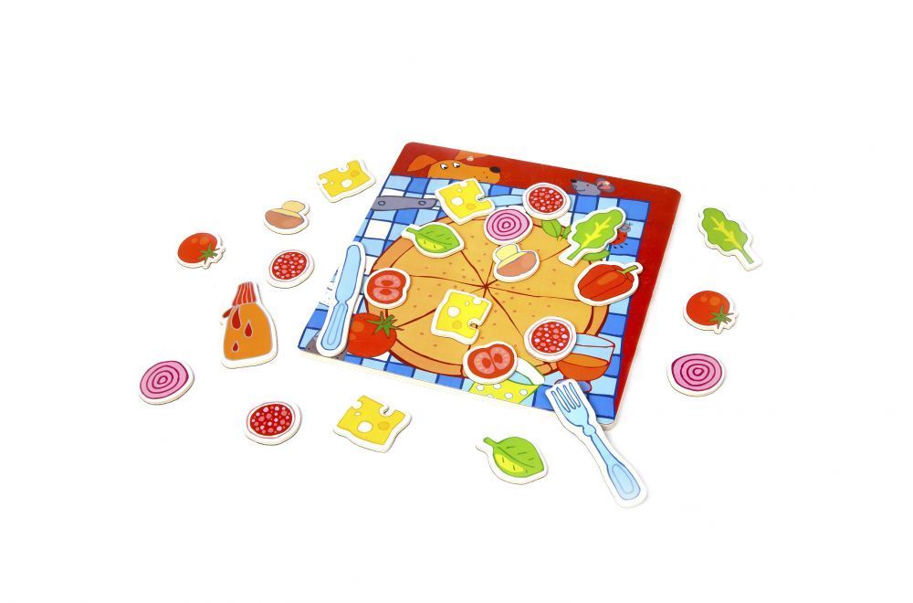 W zestawie znajduje się aż 25 magnetycznych elementów do przyczepiania. Są tu nie tylko elementy do pizzy, ale także sztućce. Plansza, do której przyczepiane są elementy, jest dwustronna, co daje więcej możliwości zabawy. Wystarczy odrobina wyobraźni i do woli można eksperymentować i łączyć składniki.