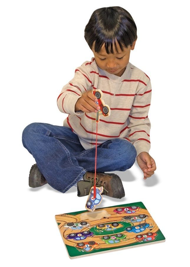Układanka magnetyczna z lawetą Melissa & Doug to zabawka 2w1. Może ona posłużyć jako zwykła układanka, w której trzeba dopasować elementy do odpowiedniego wgłębienia w podstawie oraz jako narzędzie do zabawy w łowienie elementów na magnes. Obie te aktywności pozytywnie wpływają na rozwój koordynacji oko-ręka oraz gwarantują miło spędzony czas.