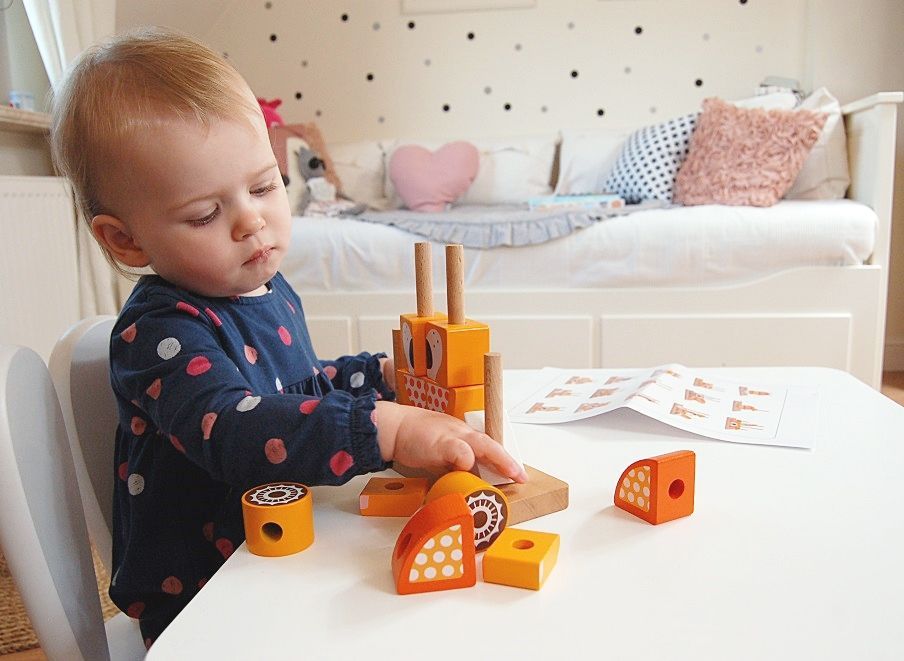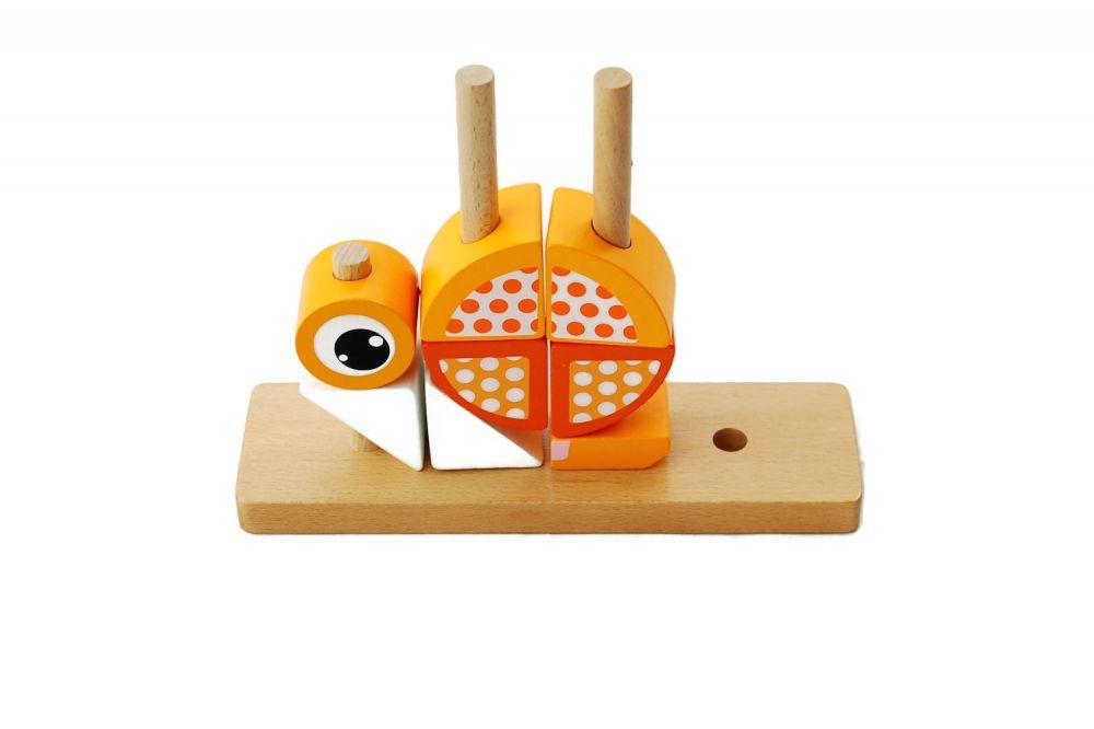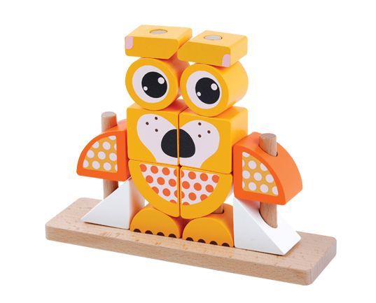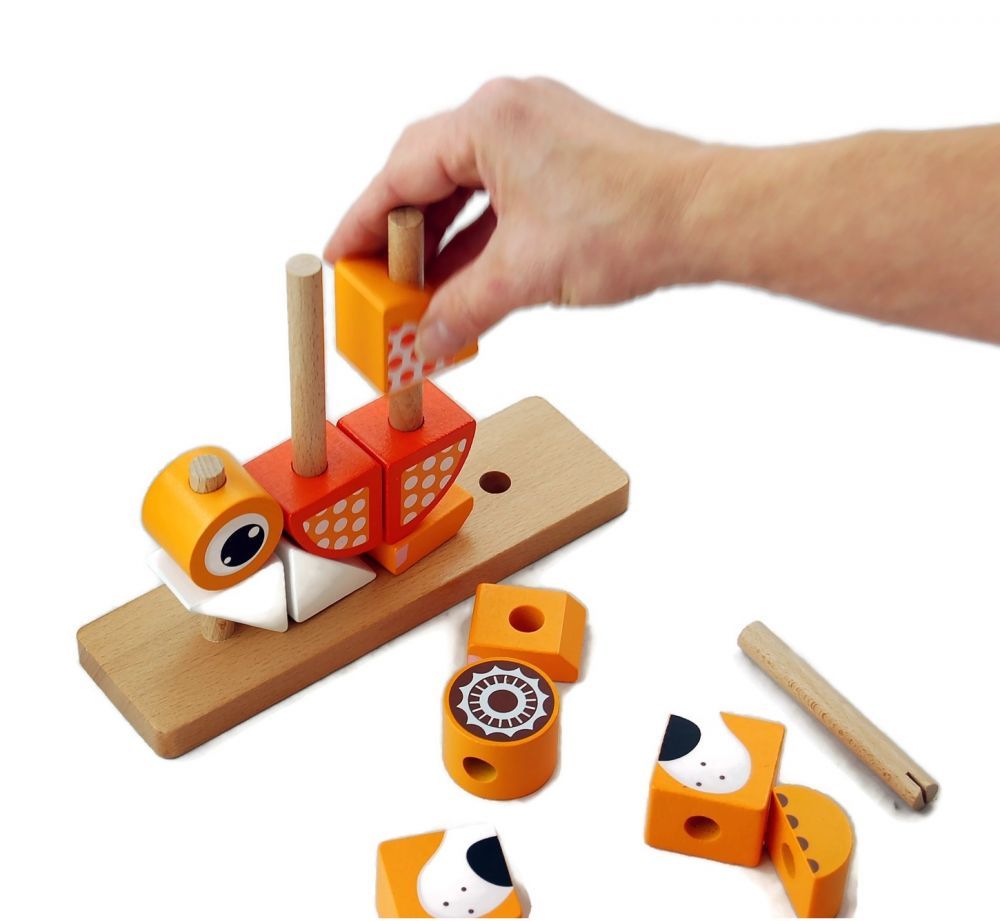 Zestaw zawiera drewnianą podstawę z otworami, cztery paliki o różnej długości (można je włożyć do otworów w podstawie w dowolnej konfiguracji), klocki o różnych kształtach oraz kartę z przykładowymi kompozycjami. Klockami można się również bawić poza palikami. Układanie wspomaga rozwój kreatywności oraz gwarantuje mnóstwo radości!