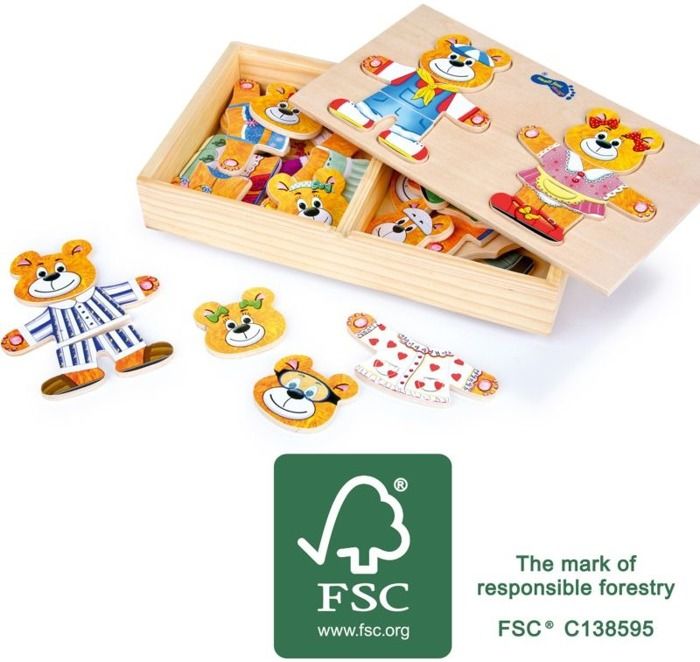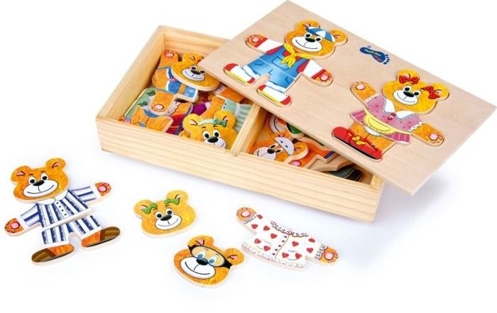 Układanka „Pan i Pani Miś” to klasyczna układanka, która polega na przebieraniu postaci – w tym przypadku pary misiów. Jest mnóstwo wariantów strojów, które dziecko może zaoferować naszych bohaterom. Taka zabawa doskonale rozwinie wyobraźnię malucha.