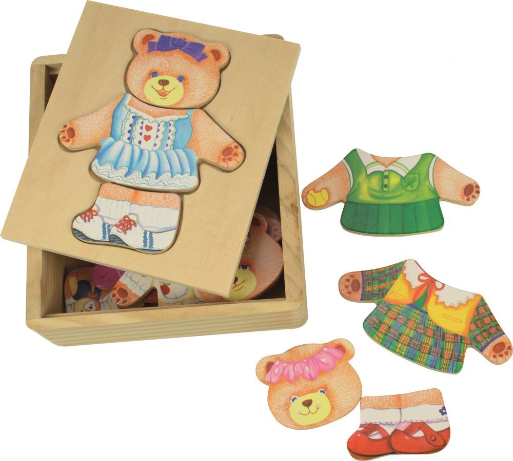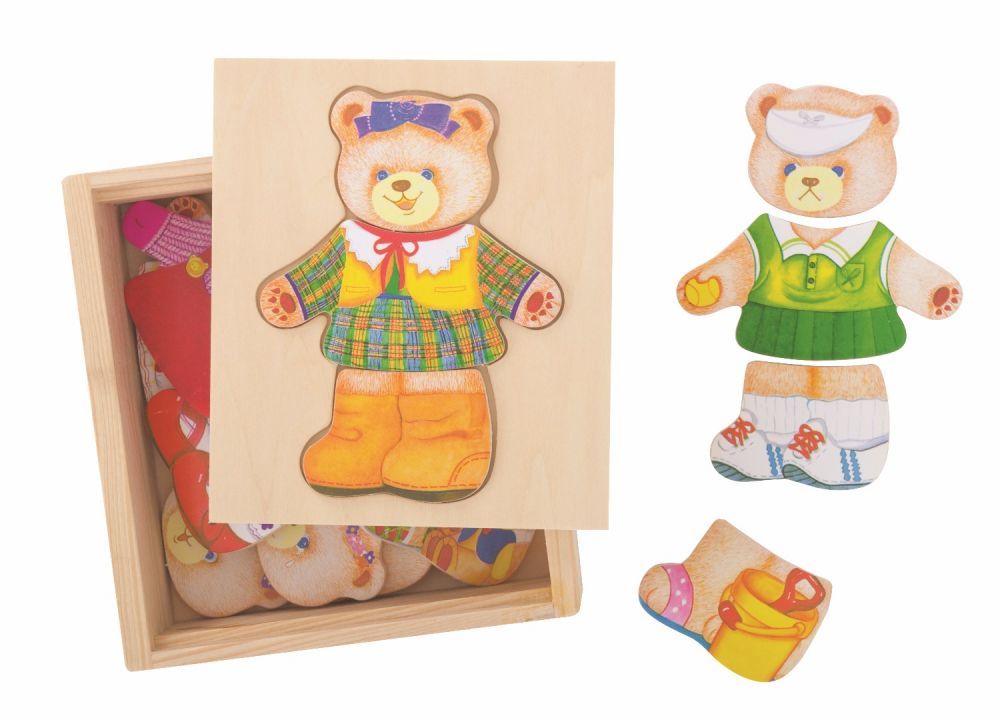 Układanka Pani misiowa Bigjigs to nauka i zabawa w jednym! Bohaterką układanki jest urocza Pani Misiowa. Składa się ona z trzech elementów – głowy, tułowia oraz nóg. Każdy z elementów występuje w 6 różnych wersjach – maluch ma do wyboru różne minki, różne bluzeczki i buciki.