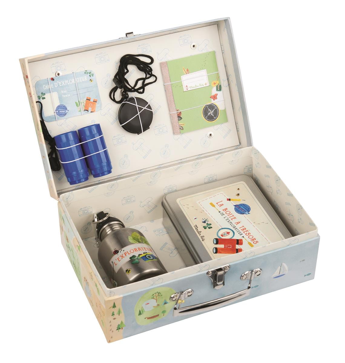 Z tą walizką można odkrywać świat. Walizka do skarbów zawiera: kieszonkowy kompas, bidon metalowy, lornetkę, dziennik podróży, skrzynię na skarby, karteczkę z nadrukowanym alfabetem morsa. Niezbędny zestaw do przygody!