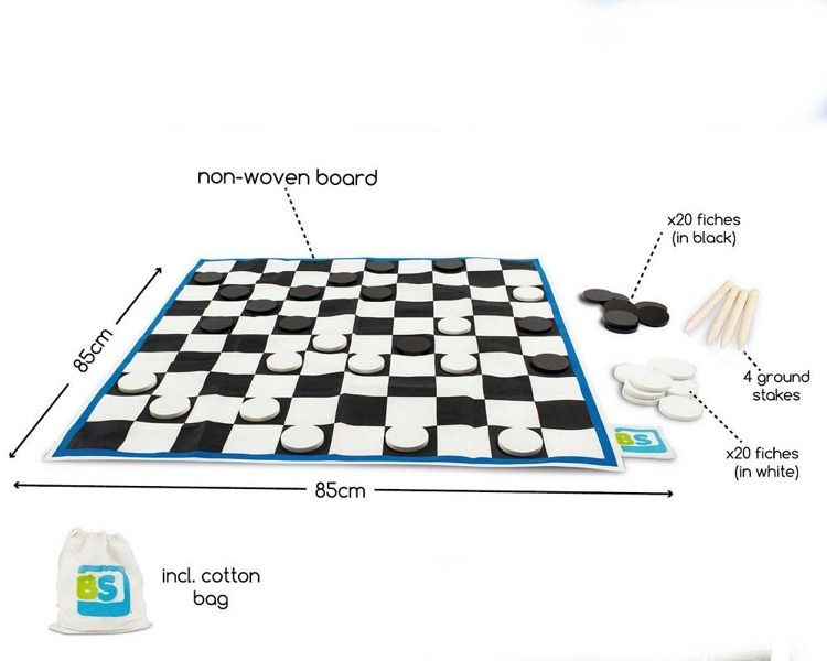 Gra w warcaby to niezawodny sposób na nudę! W pudełku dziecko znajdzie wykonaną z włókniny matę w rozmiarze XL, 40 pionków (20 czarnych i 20 białych) oraz cztery kołki. Matę można rozłożyć w domu, na przykład na dywanie w salonie, lub na świeżym powietrzu na trawie czy asfalcie. Celem gry jest „zbicie” wszystkich pionków przeciwnika. Po skończonej zabawie pionki i kołki można schować do poręcznej bawełnianej torby.