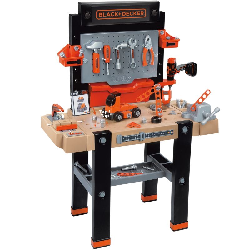 Zabawki francuskiej firmy Smoby cechuje bardzo wysoka jakość wykonania. Są wykonane z najwyższą starannością z trwałych materiałów i pomalowane bezpieczną dla dzieci farbą. Zestaw składa się z warsztatu, piły elektronicznej, imadła, narzędzi: wiertarki mechanicznej, młotka, klucza, piły, śrubokręta, imadła oraz wielu innych. Wyjątkowa forma zabawki zapewni doskonałą rozrywkę maluchom!