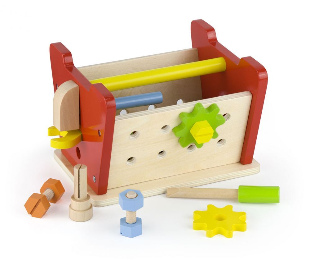 Warsztat to z jednej strony stół roboczy z otworami do przykręcania elementów oraz wbijania gwoździ. Po obróceniu – staje się on wygodną skrzynką na narzędzia z uchwytem do przenoszenia! W zestawie znajduje się: drewniany warsztat z miarką na górze i otworami na górze i na dwóch bocznych ściankach, klucz, młotek, śrubokręt, 3 koła zębate, 5 drewnianych elementów do przykręcania, 8 śrubek, 8 nakrętek i 2 gwoździe.