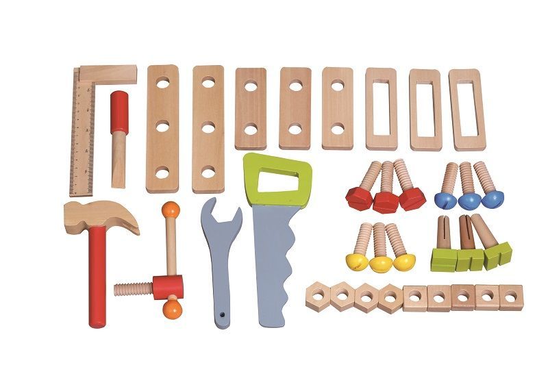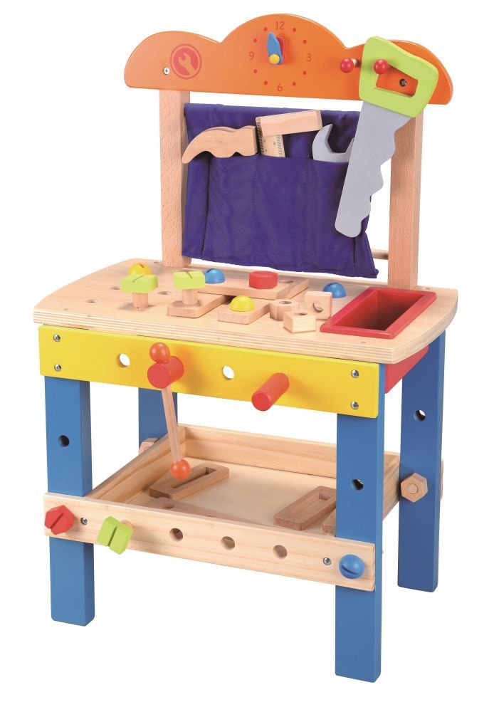 Warsztat majstra to wszystko czego potrzebuje mały majsterkowicz! Całość składa się z aż 49 elementów w tym m.in. wielu różnych narzędzi takich jak imadło, klucz, młotek itp., śrubek i nakrętek oraz stołu warsztatowego do samodzielnego złożenia. Produkt wykonano z wysokiej jakości drewna, dzięki czemu wszystko jest trwałe i solidne.
