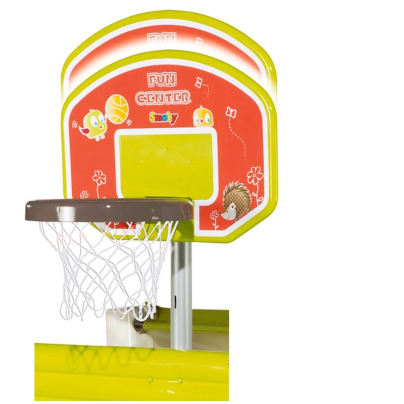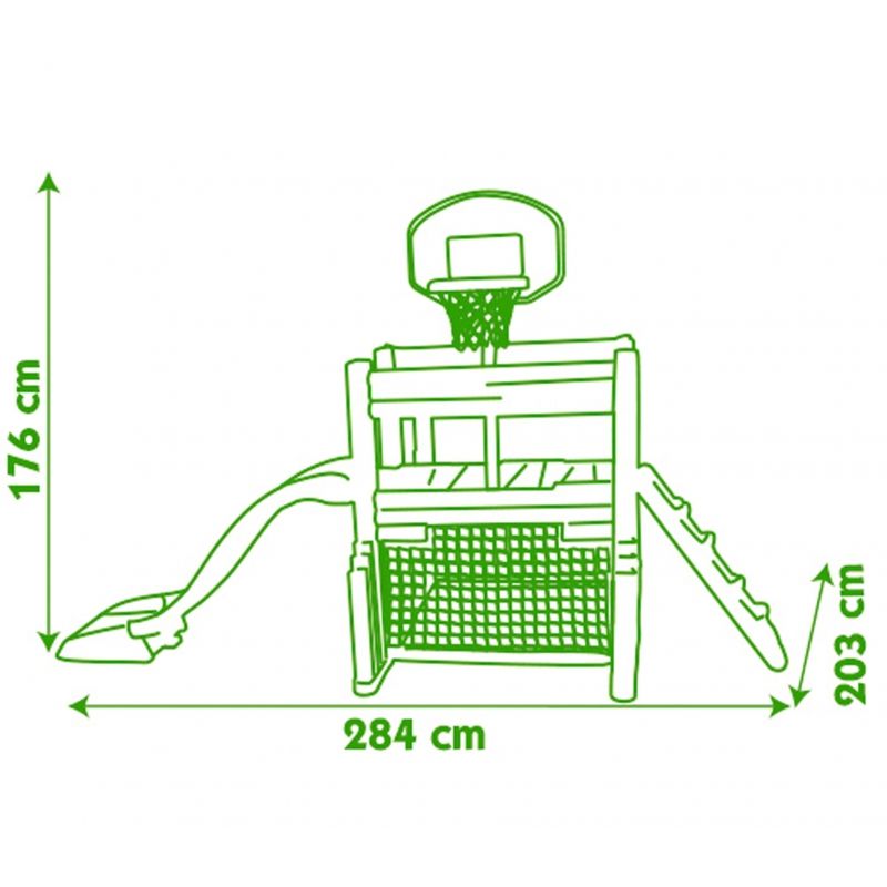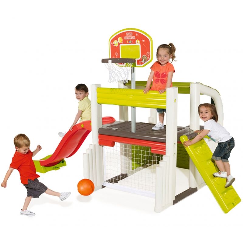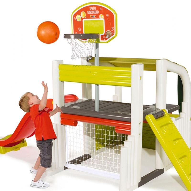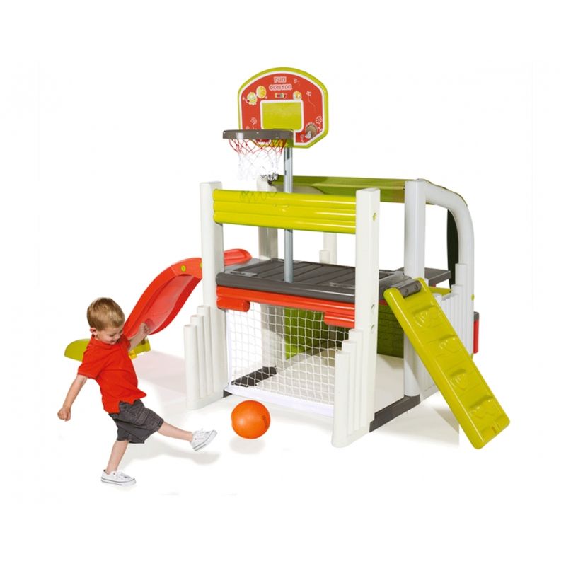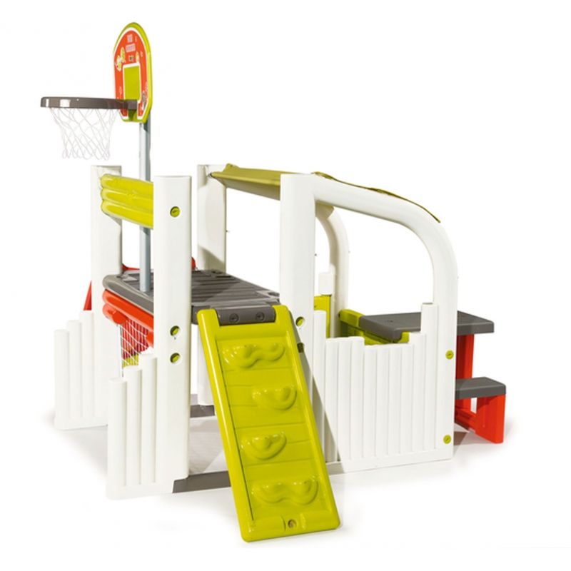 Zabawki francuskiej firmy Smoby cechuje bardzo wysoka jakość wykonania. Są wykonane z najwyższą starannością z trwałych materiałów i pomalowane bezpieczną dla dzieci farbą. Plac zabaw wyposażony jest w zjeżdżalnię o długości ślizgu 150 cm, ściankę wspinaczkową, kosz do koszykówki, bramkę z siatką do piłki nożnej, stolik piknikowy z dwiema ławeczkami oraz zadaszone miejsce do zabawy. Wyjątkowa forma zabawki zapewni doskonałą rozrywkę maluchom!