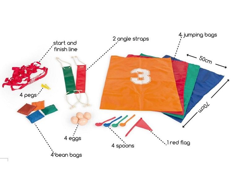 Zestaw animacyjny z workami do skakania świetnie sprawdzi się podczas przyjęcia urodzinowego, zawodów sportowych, pikniku czy festynu. Opakowanie zawiera cztery kolorowe, wytrzymałe worki do skakania, cztery łyżeczki, cztery plastikowe jajka, dwie taśmy do zabawy w parach, cztery woreczki, cztery małe kołki, czerwoną flagę oraz linki pozwalające wyznaczyć miejsce startu i linię mety.