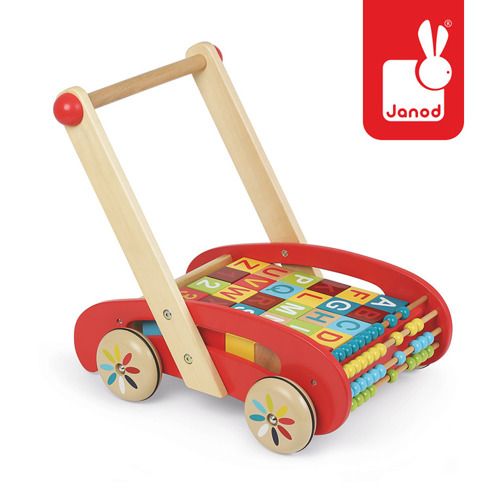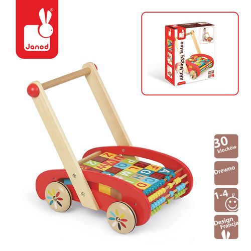Drewniany wózek, który wesprze ogólny rozwój Twojego dziecka. Zabawka wyposażona jest w 30 drewnianych klocków, z których można układać różne budowle, a także uczyć się liczb i liter. Z przodu wózka zamontowano liczydło pozwalające nauczyć się podstaw matematyki.