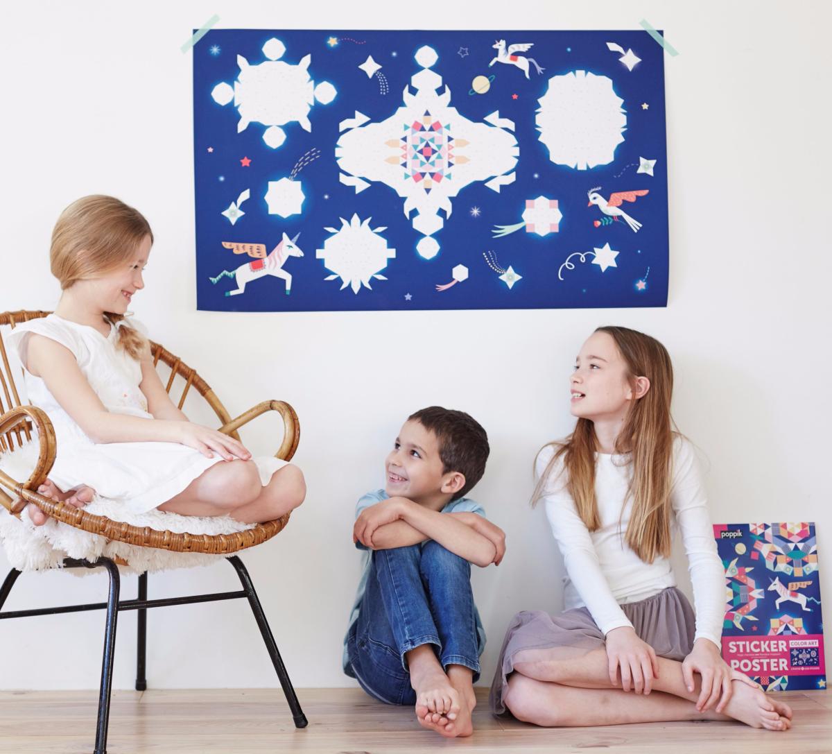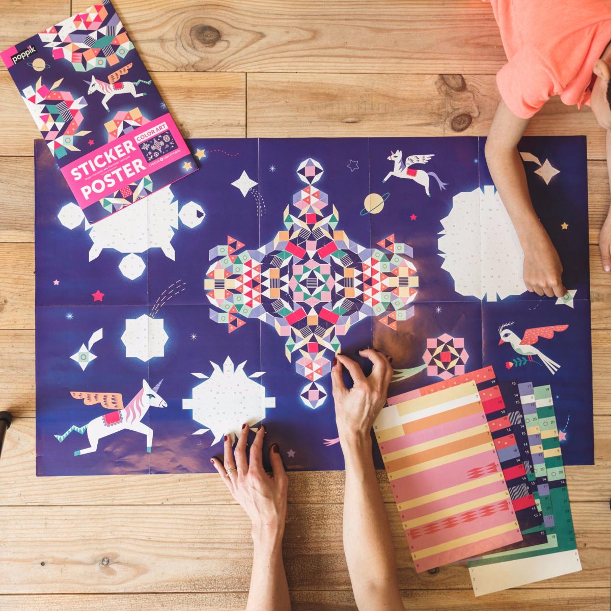 Wyklejanki Poppik z kolekcji Arty zapraszają nas do bardzo kolorowego, pięknego świata. Kolekcja ta zawiera różne rodzaje naklejek – niektóre mają wzory, inne mają różne kształty (trójkąty, kształt diamentu itp.). Ucieknij w magię gwieździstej nocy, tworząc kolorowe gwiazdy-mandale w stylu kalejdoskopu. Motyw ten został stworzony przez Sarah Andreacchio, artystkę pasjonującą się dekoracją, która dzieli z Poppikem upodobanie do wyrafinowanych i nowoczesnych kolorów.