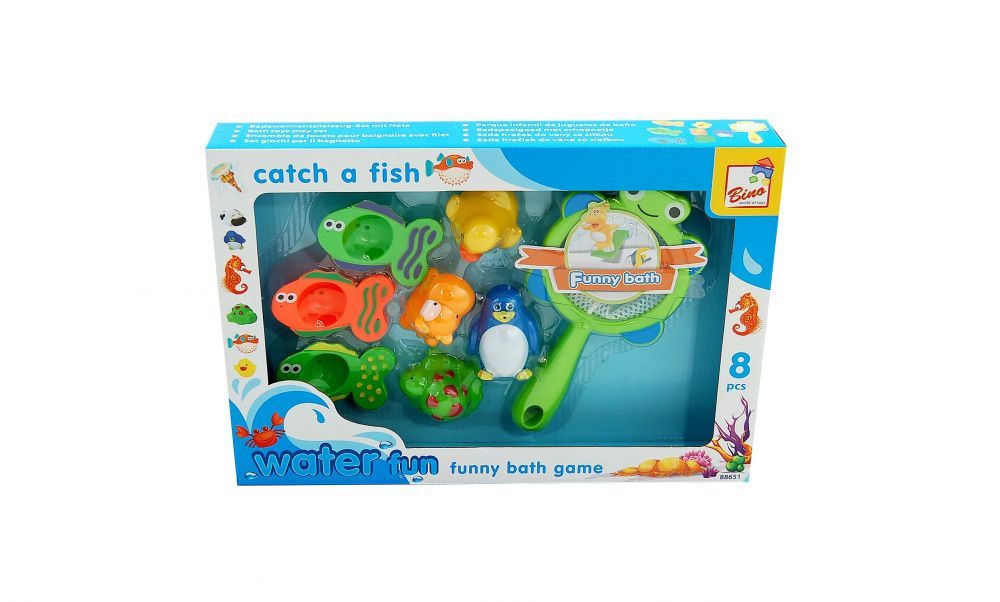 Zabawka do kąpieli siatka z morskimi zwierzętami Bino</H2> to produkt, który sprawi, że każde dziecko będzie z niecierpliwością wyczekiwało pory kąpania! Zabawki gwarantują doskonałą zabawę w wodzie – pływają po powierzchni oraz nabierają wody, którą można później psikać. Do tego są pięknie wykonane. W zestawie znajdują się 4 gumowe morskie zwierzątka, 3 rybki oraz siatka, którą można łapać pływające stworzonka. Złapanie pływających zabawek do siatki wcale nie jest takim prostym zadaniem – podczas tej zabawy dziecko ćwiczy precyzję ruchów oraz koordynację ruchową.