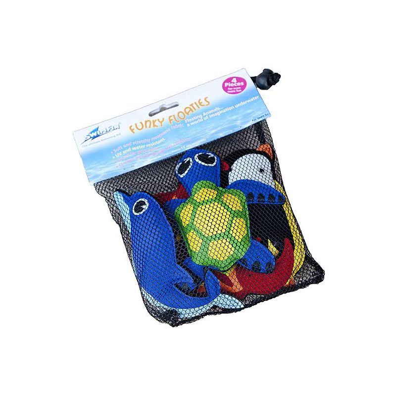 Elementy zestawu wykonane są z neoprenu, nie absorbują nadmiaru wody oraz są odporne na promienie UV. Całość zapakowana została w torebkę z siateczki, która umożliwia odprowadzenie nadmiaru wody zgromadzonej na zabawkach. Ułatwia także zabieranie ze sobą zabawek na basen czy plażę.