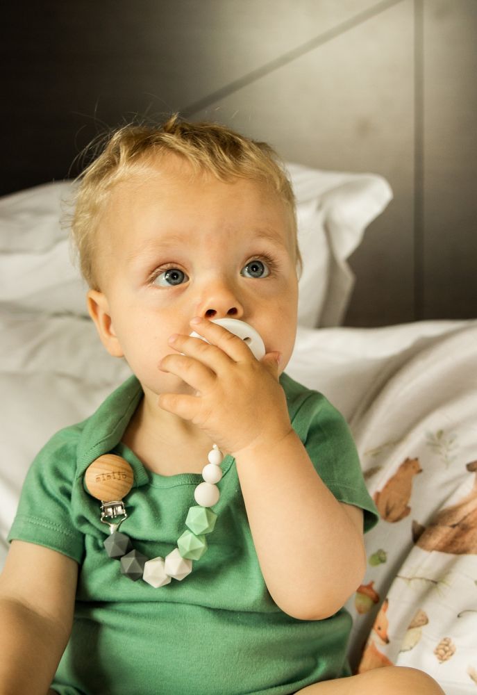 Produkt zdobią koraliki, lecz są one nie tylko ozdobą – mogą posłużyć jako gryzak. Silikonowe koraliki będą koiły dziąsła ząbkujących dzieci. Koraliki wykonano z atestowanego, nietoksycznego silikonu. Produkt wykonano ręcznie w Czechach, spełnia on normy EN71 i EN 1400. Zabawka nie zawiera BPA, ftalanów, kadmu ani ołowiu. Zawieszkę należy myć ciepłą wodą z mydłem, a po umyciu zostawić do wyschnięcia. Koraliki mają różne kolory i kształty, co sprawia, że zawieszka prezentuje się niezwykle oryginalnie.