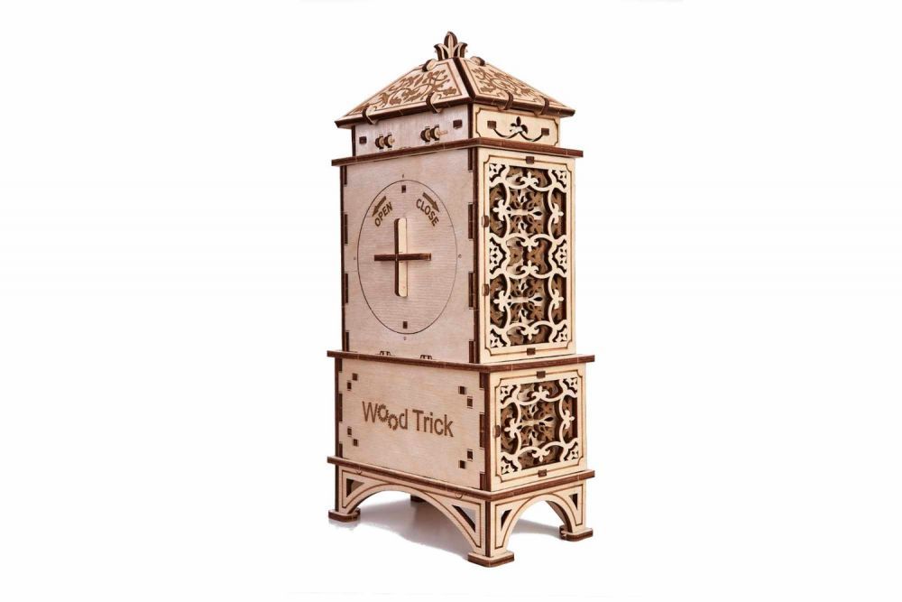 Zegar klasyczny do składania Wood Trick to niezwykły zestaw puzzli mechanicznych, który zapewni długie godziny wciągającej i rozwijającej zabawy. Do złożenia jest elegancki, klasyczny zegar. Aby zegar wyglądał jeszcze efektowniej możemy pomalować farbami jego części przed lub po składaniu. Na dole i na górze zegara znajdują się szufladki, w których można schować różne drobiazgi. W zestawie znajduje się dokładna instrukcja montażu, drewniane panele ze sklejki z naciętymi elementami (należy je wypchnąć przed montażem) oraz tarcza zegara działająca na baterię. Części są ponumerowane, aby zminimalizować ryzyko pomyłki. Aby zegar działał należy użyć dwóch baterii AA (nie są one częścią zestawu).