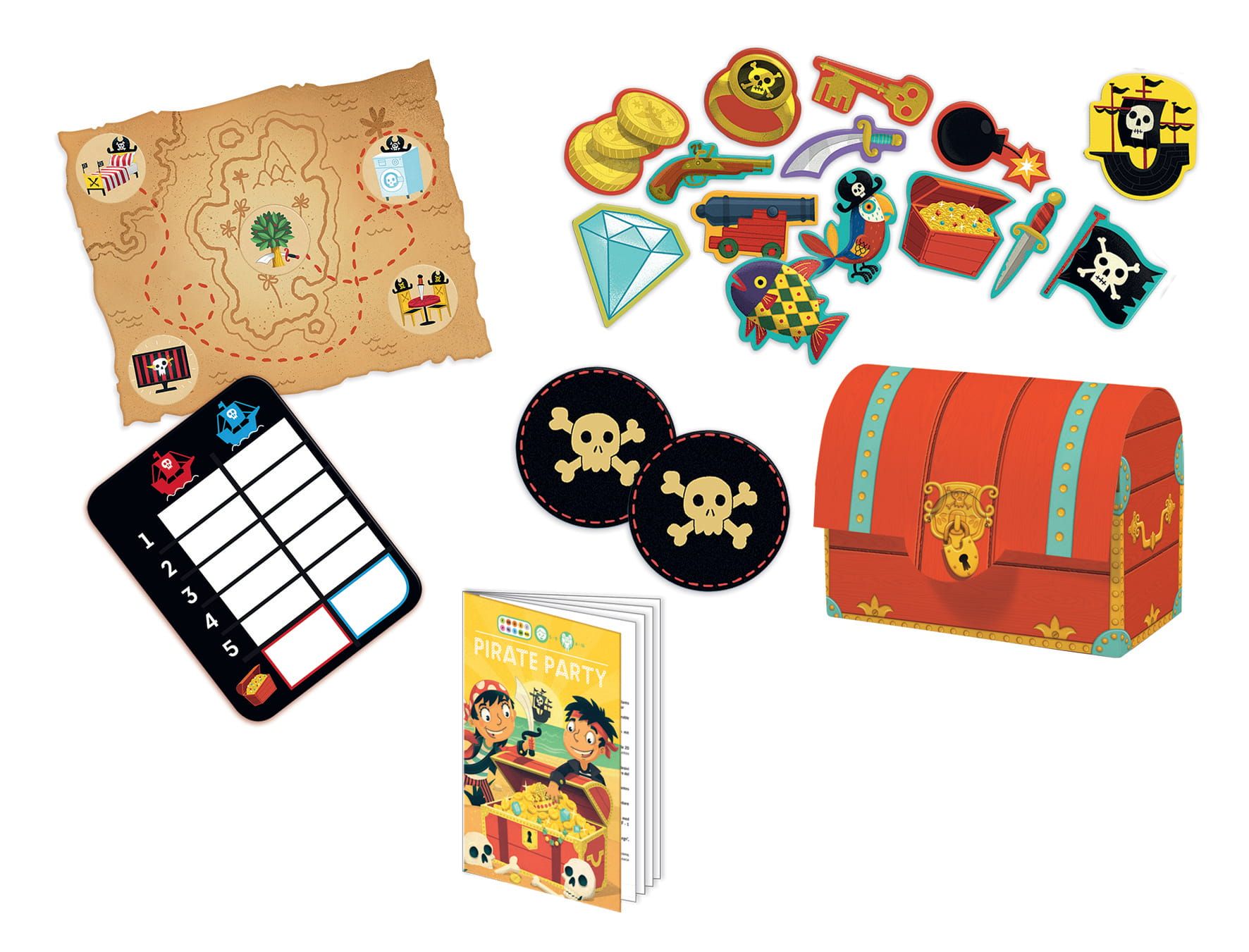 Z kompletem Pirate Party Twojemu smykowi i jego przyjaciołom nie grozi nuda! Podczas zabawy dzieci będą musiały wykazać się sprytem, spostrzegawczością, a także umiejętnością analitycznego myślenia. Elementy zestawu są kolorowe i starannie wykonane, dzięki czemu od razu przyciągają wzrok. Gry wykonała francuska firma Djeco – producent pomysłowych zabawek, które zachęcają malców do podejmowania nowych wyzwań.