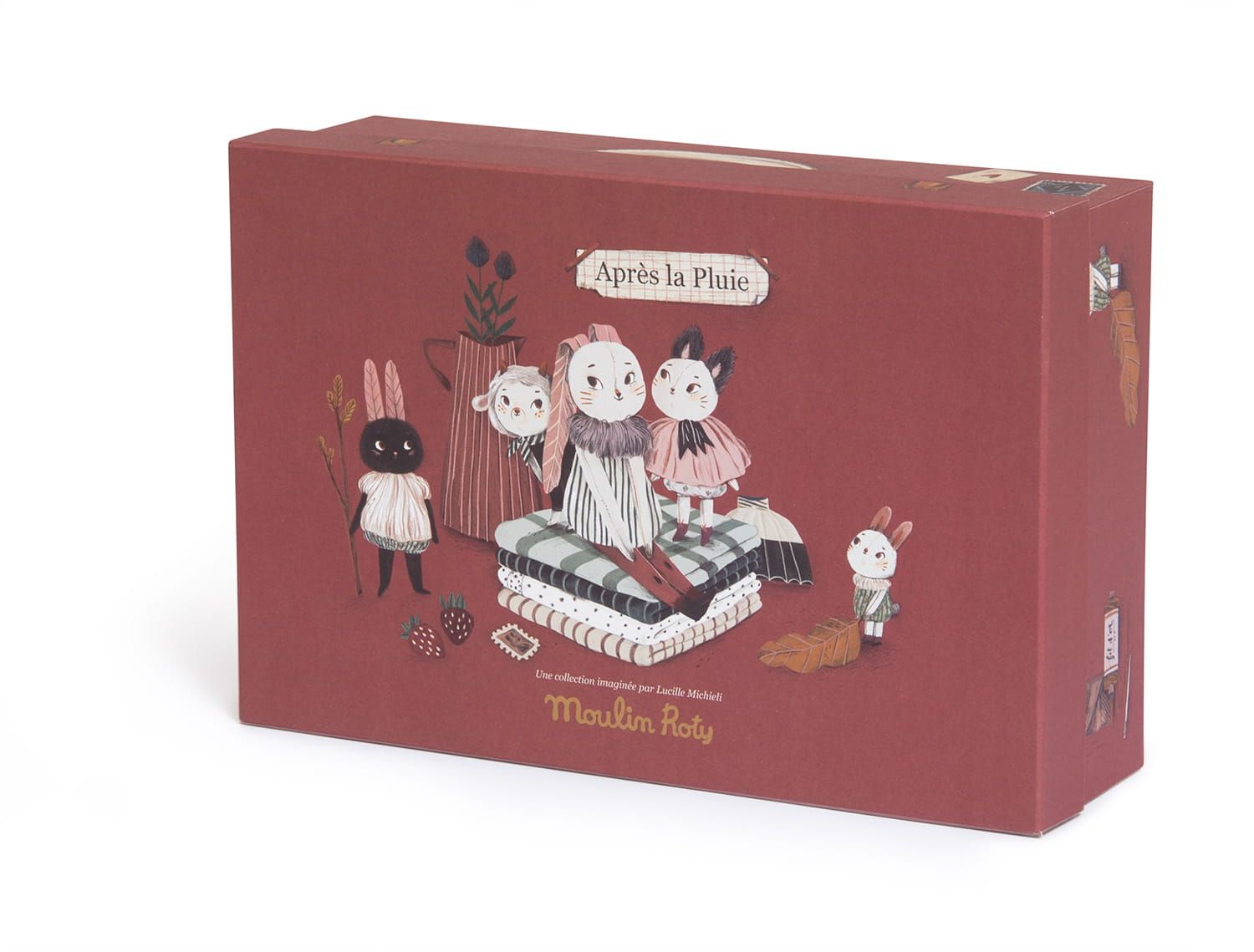 Miękkie maskotki z serii „Po deszczu” to kolekcja stworzona przez Lucille Michieli, stylistkę kolekcji Les Parisiennes. Zainspirowane wspomnieniami z dzieciństwa i japońskimi rysunkami postacie są słodkimi małymi stworzeniami, które przyszły schronić się w pokoju dziecka po spacerze w lesie. Te małe towarzyszki zabaw z haftowanymi twarzami i dużymi uszami z polaru mają na sobie ubrania z lnu i bawełny organicznej.