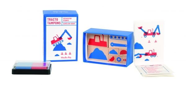 Zestaw stempli Koparka – w skład zestawu wchodzi 9 drewnianych stempli oraz 2 poduszeczki z tuszem. Każdy stempel to element koparki. Na załączonym do zestawu arkuszu narysowane są różne wzory koparek, które można stworzyć przy pomocy stempli. Całość zapakowana w kartonowe pudełeczko z wizerunkiem koparki.