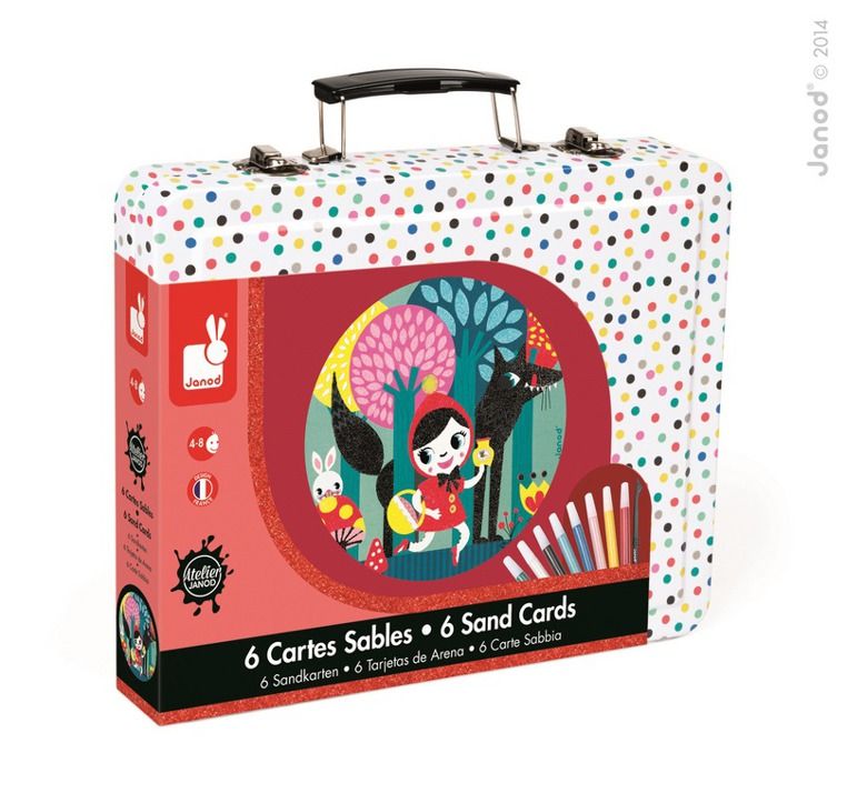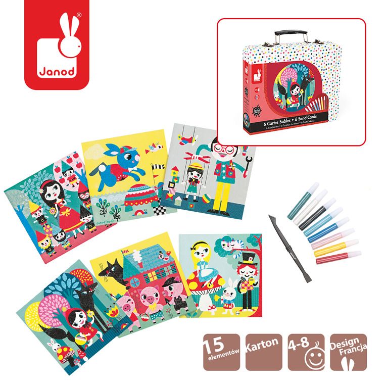 Pozwól dziecku przenieść się do kolorowego świata rodem ze znanych bajek! Podczas zabawy maluch zapozna się między innymi z Czerwonym Kapturkiem, czy Królewną Śnieżką. Dodatkowo, poszczególne elementy kart można odkleić za pomocą specjalnego narzędzia, by następnie przyozdobić je kolorowym piaskiem!