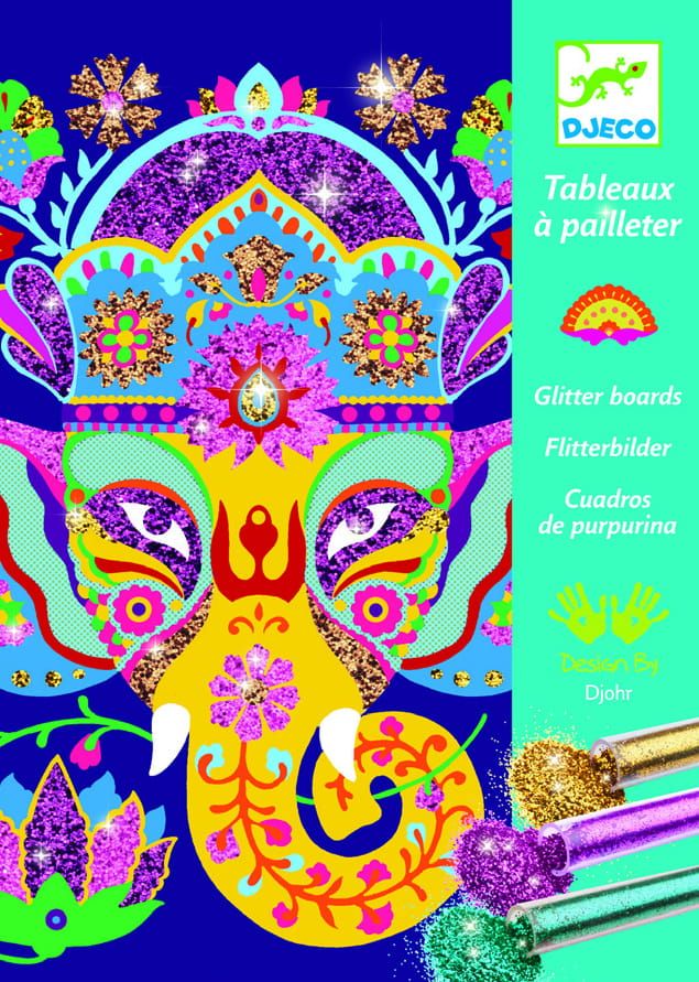 Zestaw artystyczny, w którym dziecko dekoruje obrazki za pomocą kolorowych brokatów. Kartka jest pokryta klejem, który przykryty jest perforowanym w różne wzory papierem. Za pomocą plastikowego rylca dziecko odkleja poszczególne kawałki papieru, posypując odpowiednim kolorem brokatu. Nadmiar brokatu strzepuje się dołączonym do zestawu pędzelkiem.