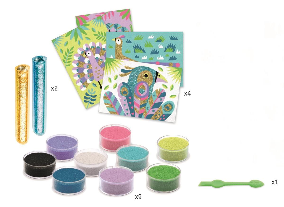 Zestaw artystyczny z piaskiem i brokatem Paw Djeco dla dzieci od 6 r.ż.