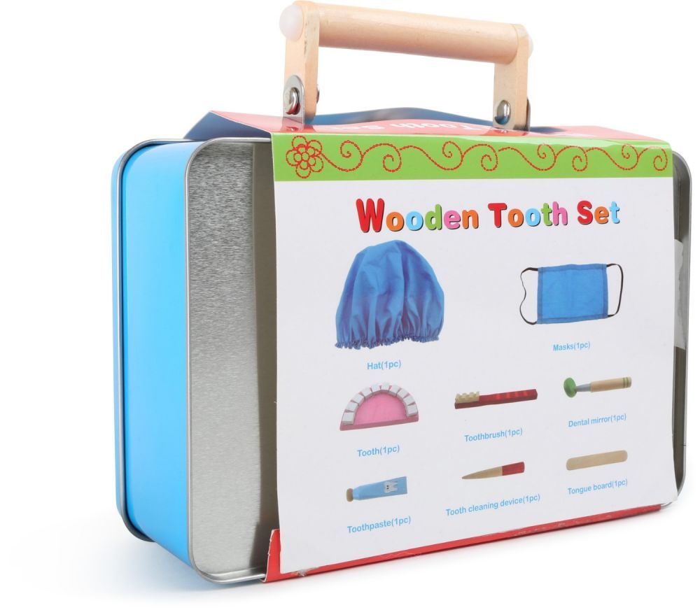 Jeśli Twój smyk przepada za zabawą w odgrywanie ról, zestaw dentysty to coś dla niego! W metalowej walizeczce z poręczną rączką dziecko znajdzie czepek lekarski, maseczkę do założenia na twarz, zęby, szczoteczkę, lusterko dentystyczne, pastę do zębów, urządzenie do czyszczenia zębów oraz patyczek do zaglądania do jamy ustnej. Elementy zestawu zostały wykonane z trwałych materiałów, więc będą służyły szkrabowi przez długi czas.